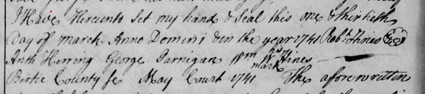 1741, March 31 — Bertie Co., N.C. — Robert Hines of Craven County sells to George House 240 acres lying on Casia Branch. George Jarnigan is a subscribing witness, along with Anth Herring and Wm (W his mark) Hines.[1]