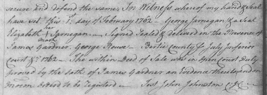 1762, 1 February — Bertie Co., N.C. — George Jernegan and Elizabeth (+ her mark) Jarnegan (his presumed wife) sell 100 acres to Ezekil Wimberly situate lying on Cashie Swamp. George warrants he has a “perfect absolute Estate of Inheritance in Fee Simple” title. Witnesses are James Gardner and George House.[10]