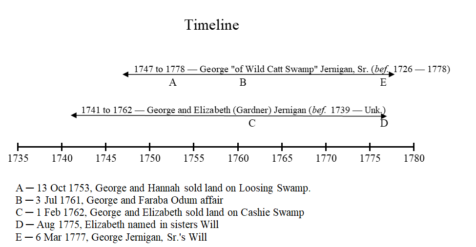 If we look at the key events on each George’s timeline, we see overlapping where George is called to appear in Court an when George and Elizabeth sell their land along Cashie Swamp. I believe George and Elizabeth relocated further south to Johnston/Dobbs counties where many Jernigan’s relocated. More research in these counties is needed to determine if they indeed relocated.